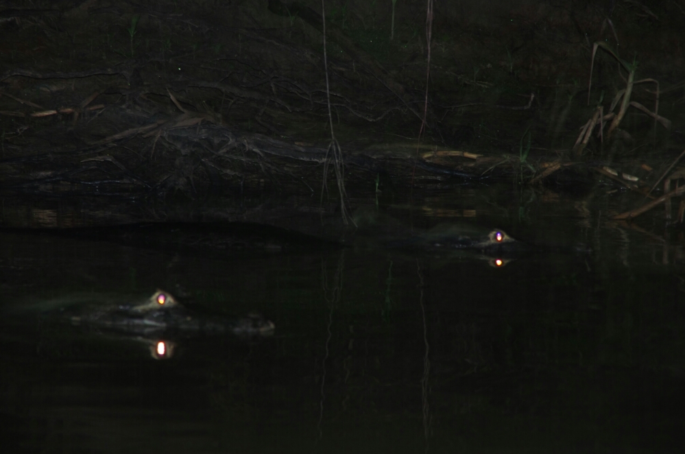 In the first night we entered our long wooden boat again to observe the alligators by night. Their eyes reflected the lights of our torches, so that we could see all the yellow lights all along the river.