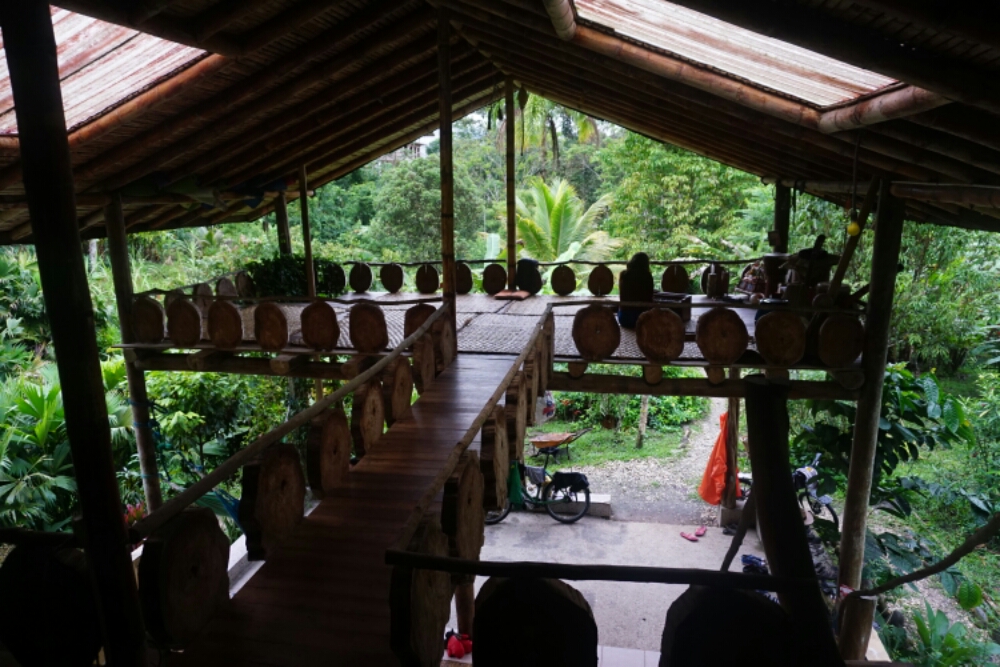 Near Tena we stayed at a Couchsurfer, which we nearly haven’t seen. Instead we encountered around 15 volunteers on his eco farm, who ran the daily business. At the same time it was a spiritual place with vegetarian and most of the time vegan food. A certain time schedule including Yoga, some hours of work and a lesson to learn something from the others gave the community their certain framework. The food, usually made by someone else, was most of the time very delicious and on the day we arrived we enjoyed self made chocolate from the Cacao plants of the farm.